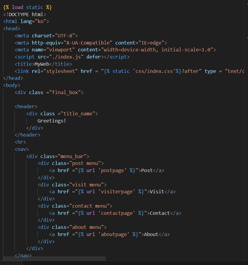 암튼 이런식으로 load static을 사용하여 사진파일 이나 css파일같은 static폴더를 참조할 수 있게 해주고