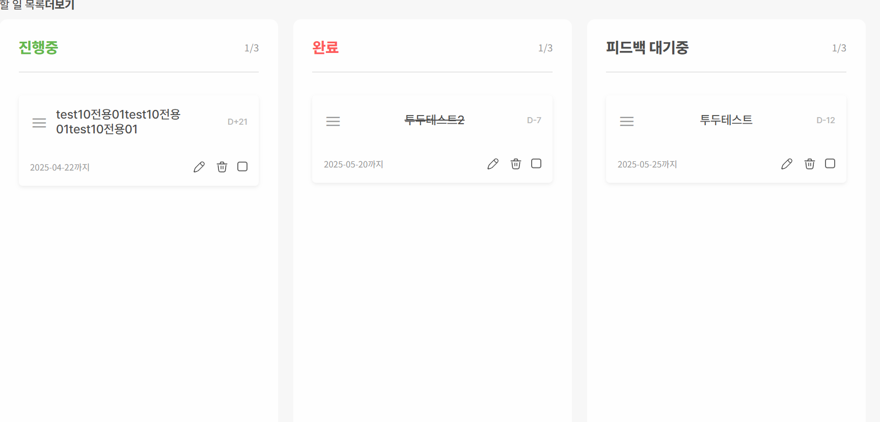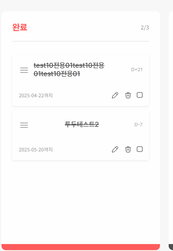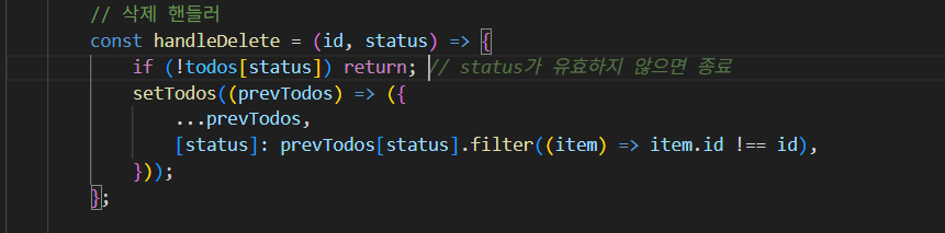 const handleDelete = async (id, status) => {if (!todos[status]) return;try {const response = await fetch(`http://127.0.0.1:8008/todos/${id}?project_id=${Pg_id}`, {method: "DELETE",});setTodos((prevTodos) => ({...prevTodos,[status]: prevTodos[status].filter((item) => item.id !== id),}));fetchTodos();updateTodoCounts();} catch (error) {}};삭제 Api만들어서 id랑 프로젝트 아이디 넣어주고 다시 fetch status해줍니다.