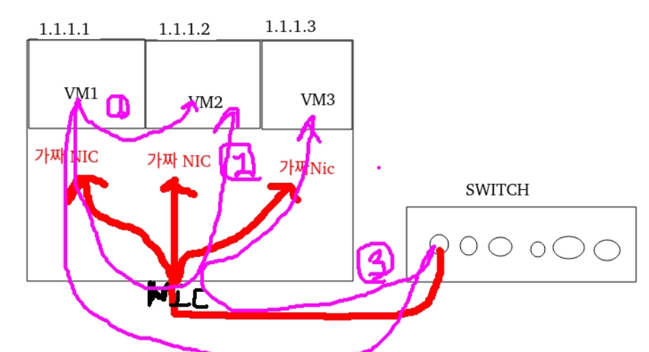 - 1번: VM들끼리는 vSwitch에서 스위칭되므로 호스트 밖으로 안 나갈 수 있음