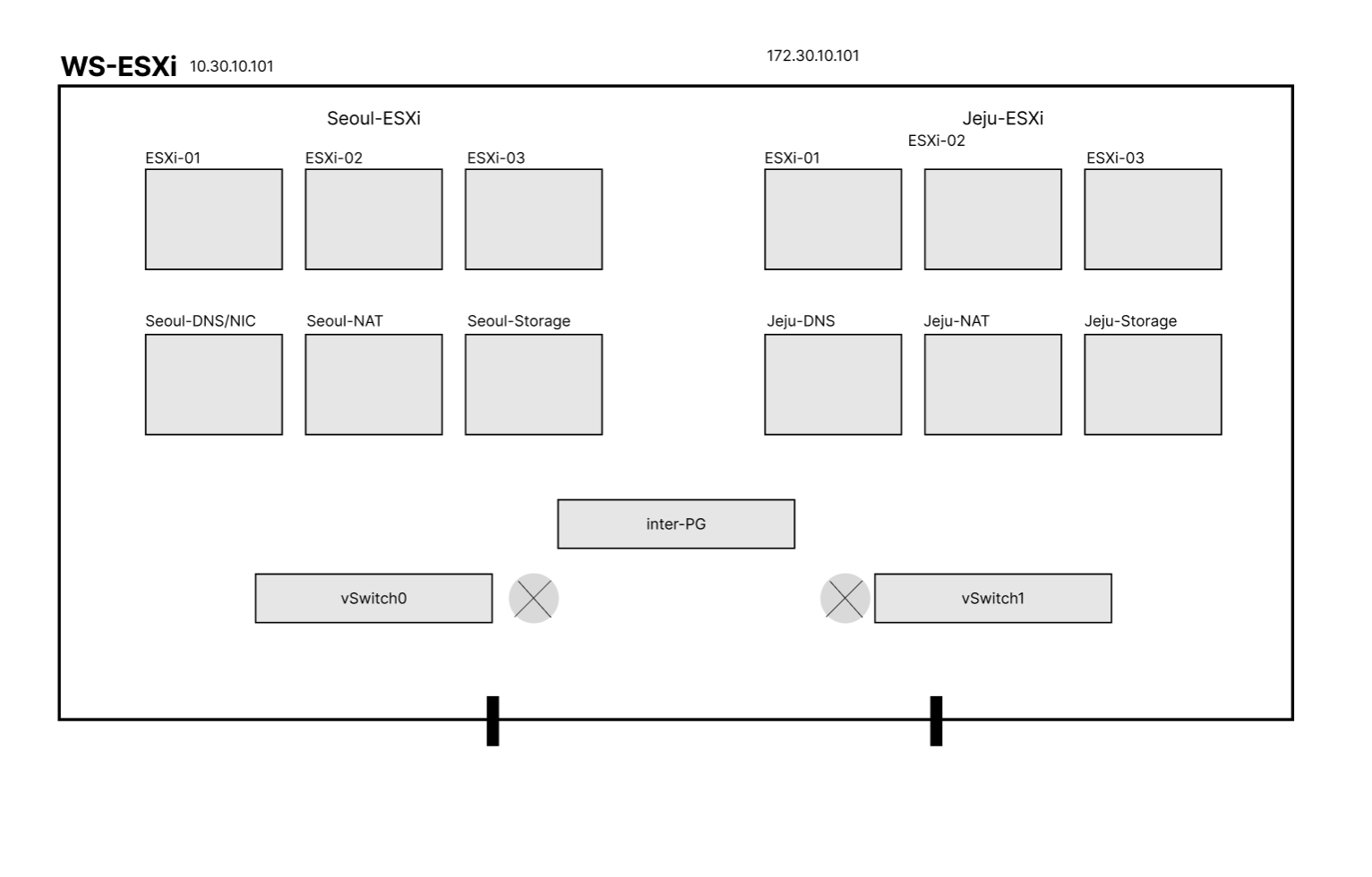 Seoul Jeju VLAN 01 : Management Network 10.30.10.0/24 172.30.10.0/24 VLAN 20 : Storage Network 10.30.20.0/24 172.30.20.0/24 VLAN 30 : vMotion Network 10.30.30.0/24 172.30.30.0/24 VLAN 40 : Inter-DC Network 10.30.40.0/24 172.30.40.0/24 VLAN 50 : Internet Network 10.30.50.0/24 172.30.50.0/24 Seoul Jeju ESXi 10.30.10.101/24 172.30.10.101/24 vCenter 10.30.10.102/24 172.30.10.102/24 DNS 10.30.10.77/24