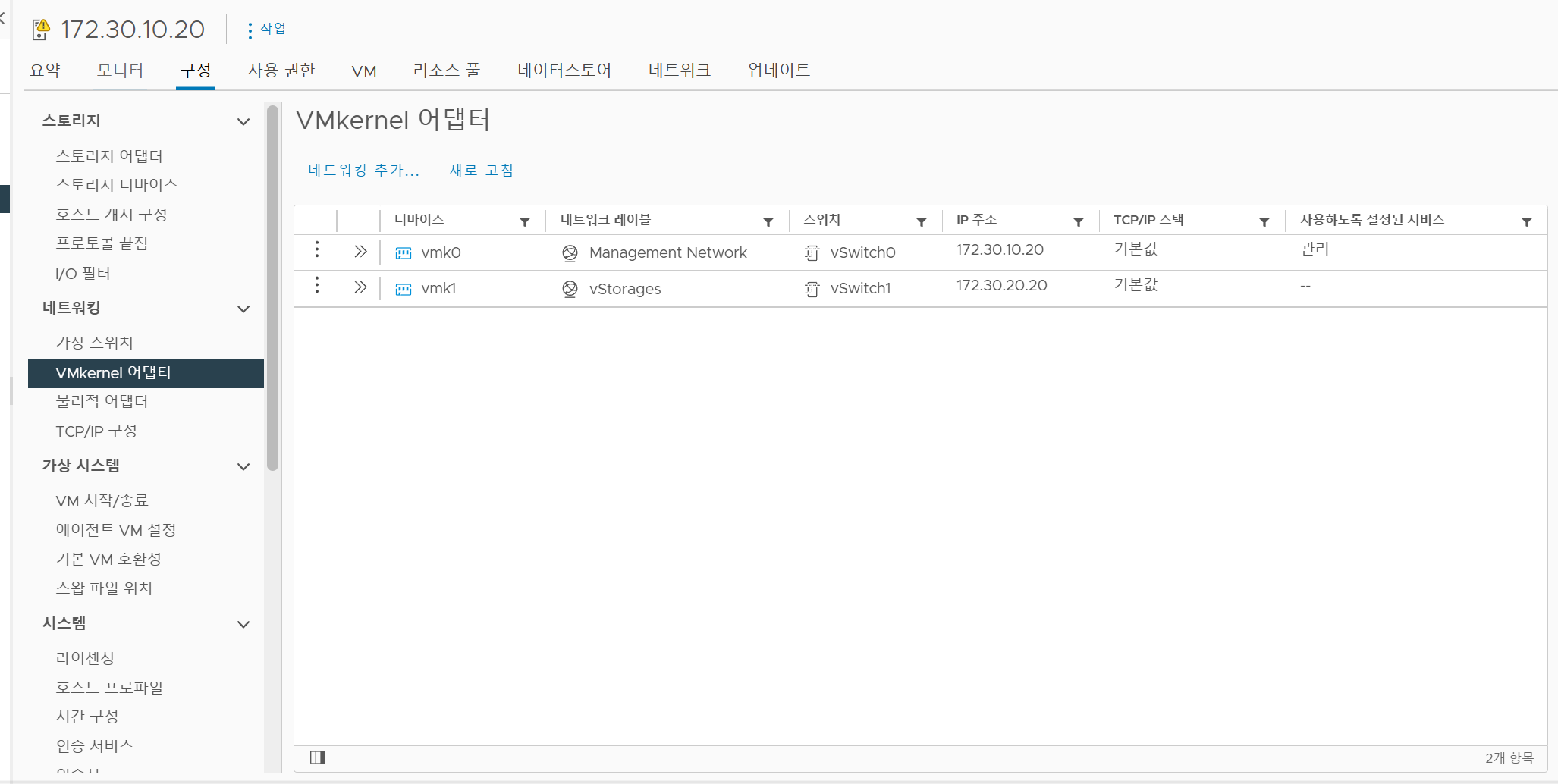 - vmk별로 10.30.10.101 / 255.255.255.0 / dns 10.30.10.77 exsi에서 설정 후