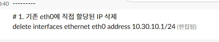 # 외부 인터넷 인터페이스가 eth1이라고 가정할 때 set nat source rule 100 outbound-interface eth1 set nat source rule 100 source address 10.30.10.0/24 # VLAN 01만 허용 set nat source rule 100 translation address masquerade # VLAN 20, 30은 NAT 규칙을 만들지 않으므로 자동으로 인터넷이 차단됩니다. commit이것두 라우터에서 설정해서 nat역할을 하기위한 설정
