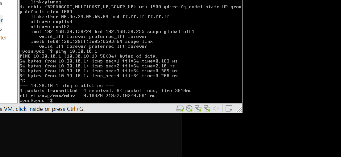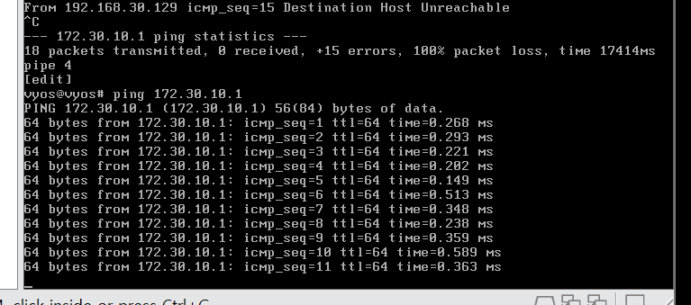 configure set interfaces ethernet eth1 address 192.168.30.130/24 set interfaces ethernet eth1 description Router-VM set protocols static route 172.30.10.0/24 next-hop 192.168.30.130/24 commit save이렇게 wan 인터페이스 추가만해두면 서로 연결되어서 연결이된다이말임 따로 NAt안쓰고
