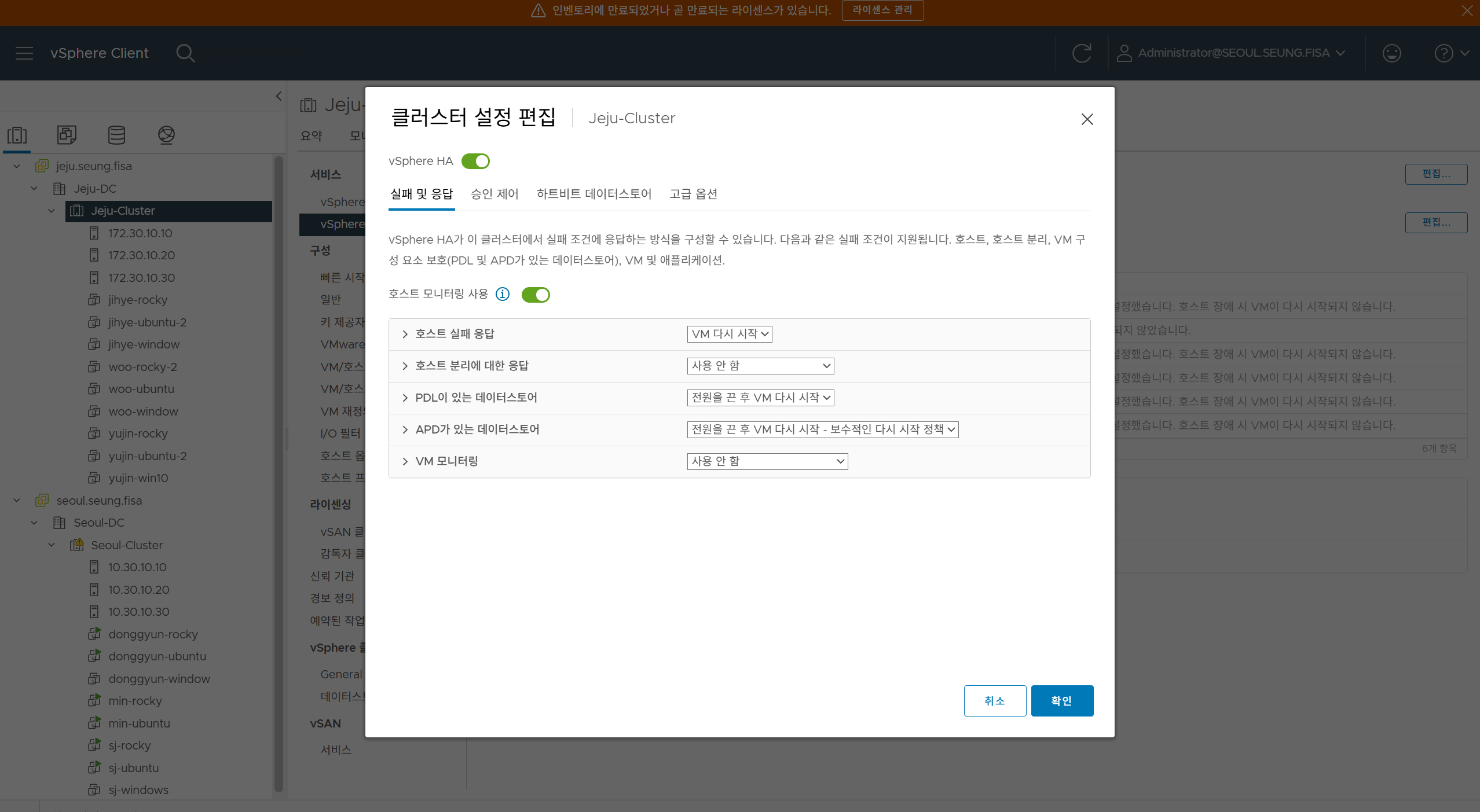 - 호스트 모니터링 사용: ESXi끼리 서로 살아있는지 감시